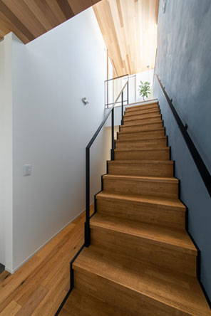 内観では景観を生かす二階リビング、玄関吹き抜けから見上げる鉄骨階段とレッドシダーの板貼り天井、LDKは天井からの照明を極力なくし24時間換気も間接照明の中へ、腰掛けられるよう段差をつけた畳コーナーなど、意匠性と機能性を兼ねたこだわりを凝縮。外構も植栽や雰囲気を相談しながら出来て良かったと、木々の成長を楽しみにしています。