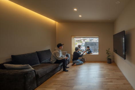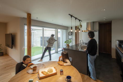 回りを気にすることなく、お子さまものびのび快適にお過ごしの日々。庭・土間・キッチンという並びで、出入りや準備が楽々なバーベキューもご計画中です。