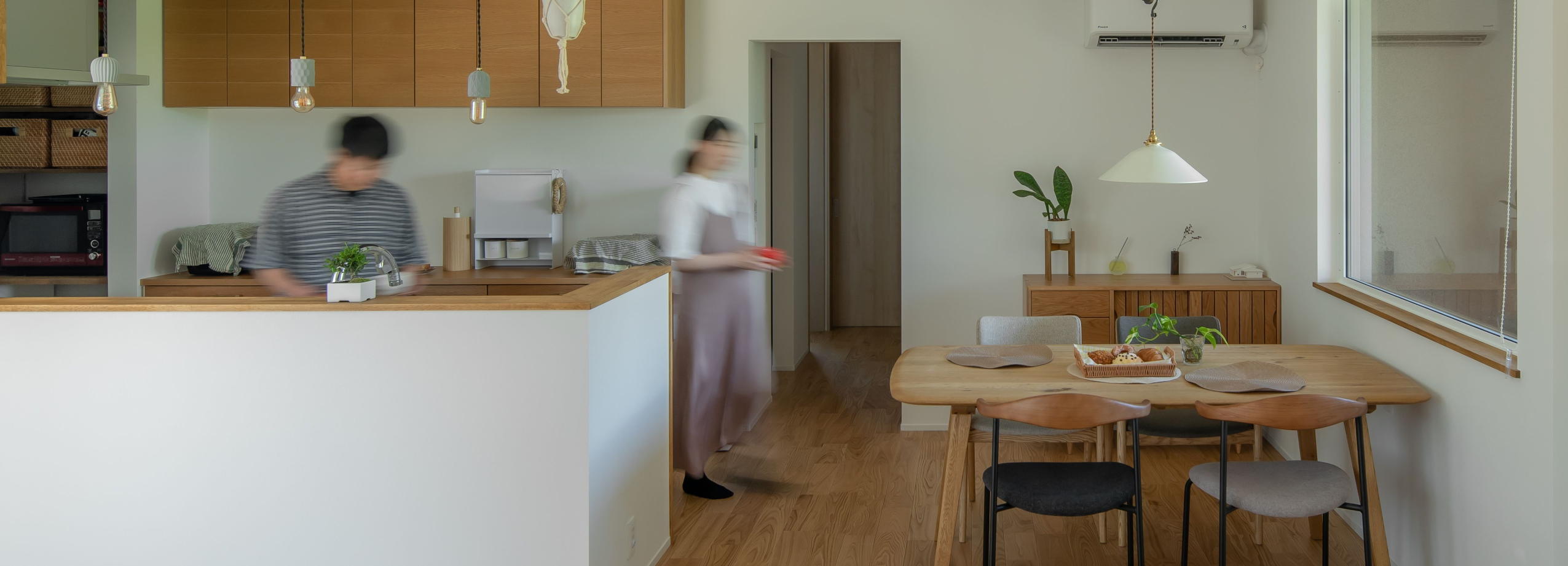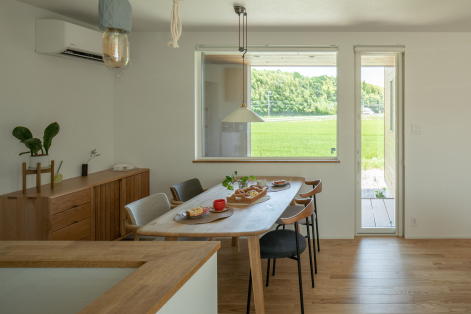 ご主人のお気に入りは、田んぼの風景を楽しめるダイニングのビューウィンドウ。その隣には裏庭へとつながる扉を設け、外との行き来がスムーズになるよう計画されました。