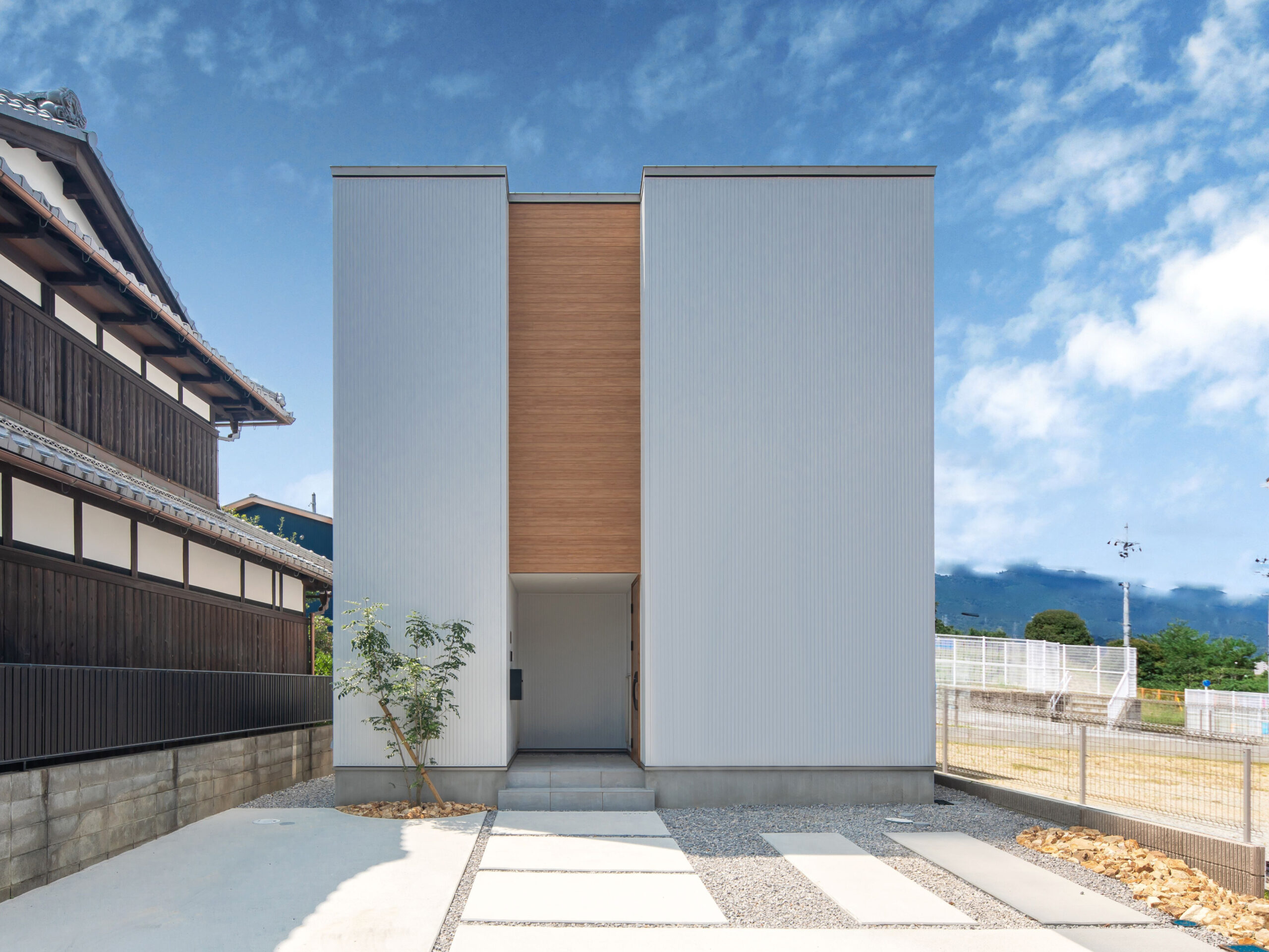 ぬくもりのある板貼りを、白のガルバリウムでサンドした箱型の外観。