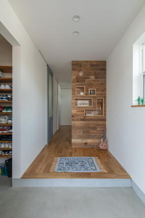 玄関に入りまず目をひくのは、古材を用いた造作。ニッチにお気に入りを置いて、家の空気感を表現するスペースに。スクエアの垂れ壁で区切ったシューズクロークに、外遊び道具なども収納。