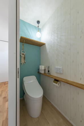 さわやかな水色を印象的に使った、クリーンなイメージのトイレ。