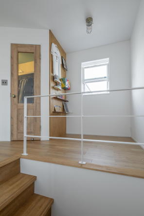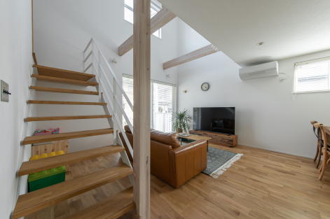 吹き抜けの梁に階段の柱、どちらも木目を残したやさしい色味で、さり気なアクセントに。