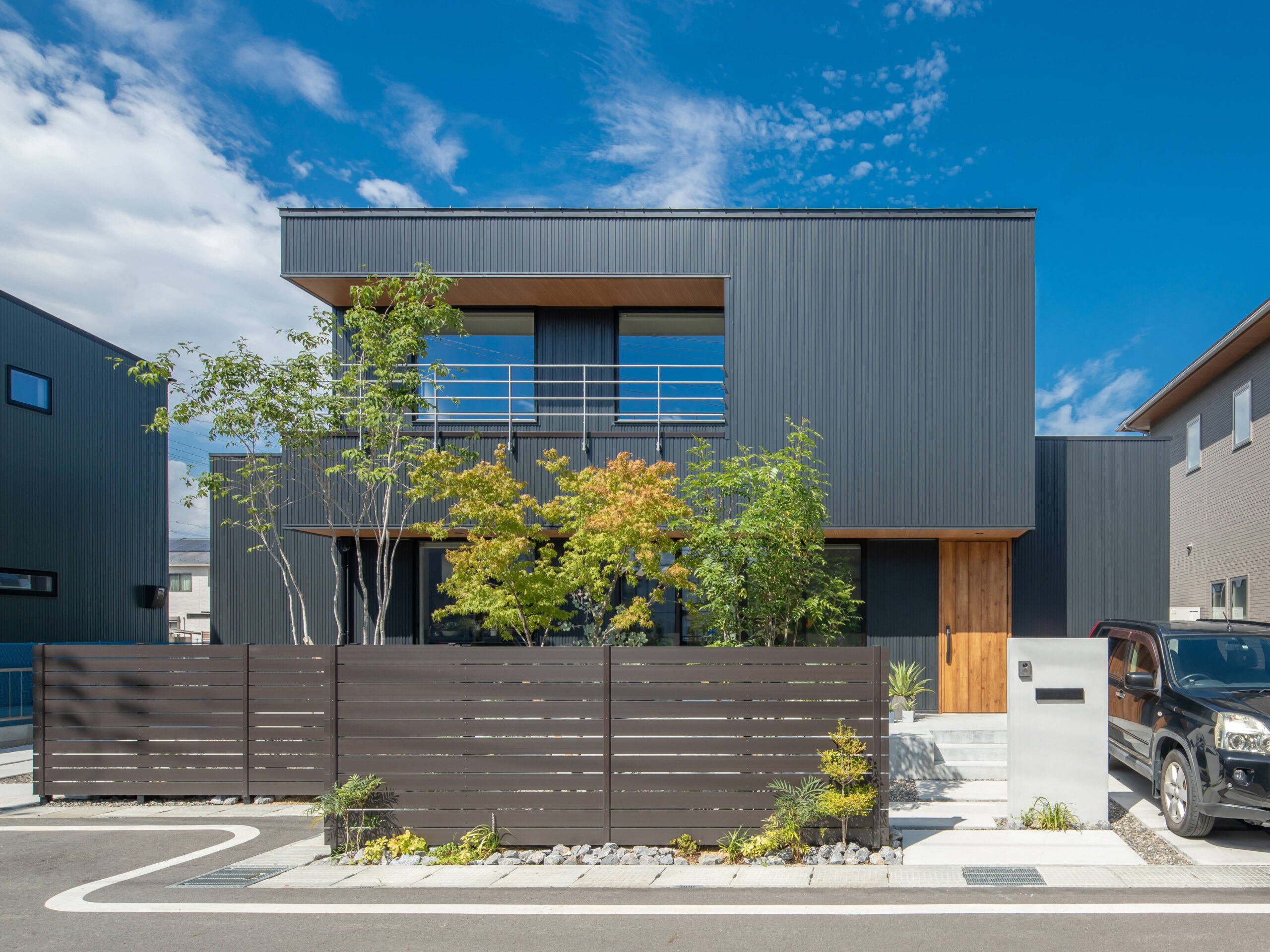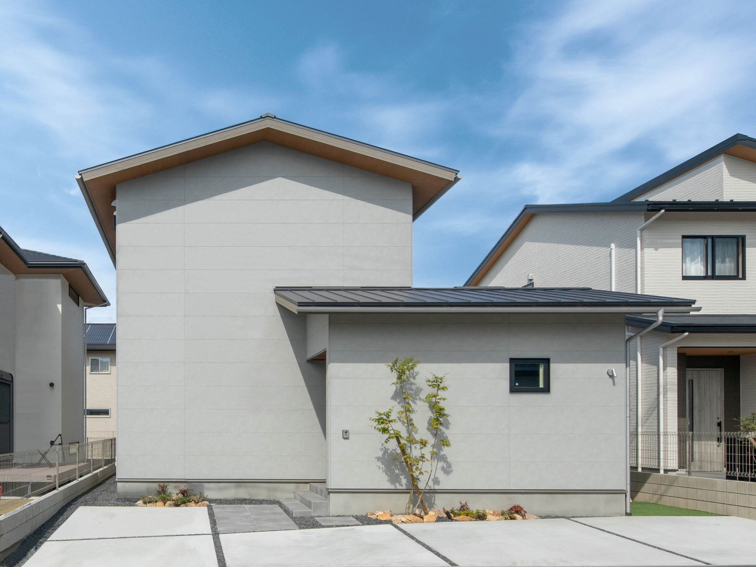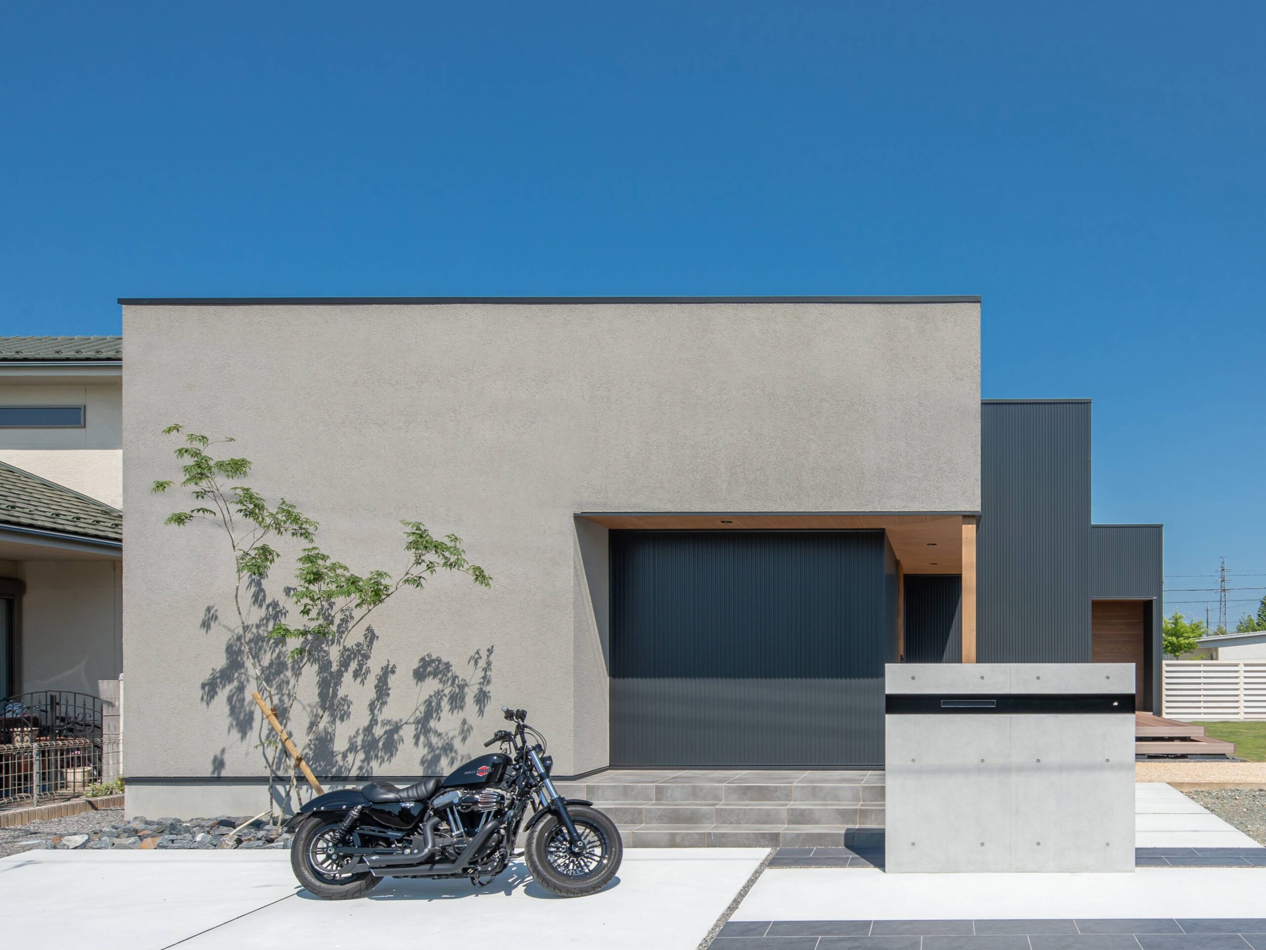 目をひく木とグレーの家